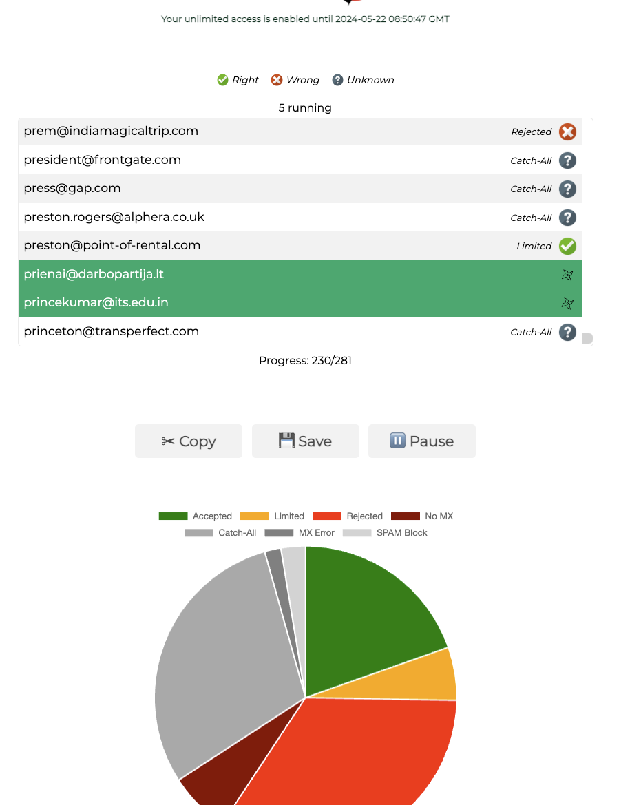 * **Invalid:** These addresses are undeliverable due to various reasons such as typos, non-existent domains, or addresses that have been deactivated. Identifying and removing these addresses helps in reducing bounce rates and maintaining a clean sender reputation.